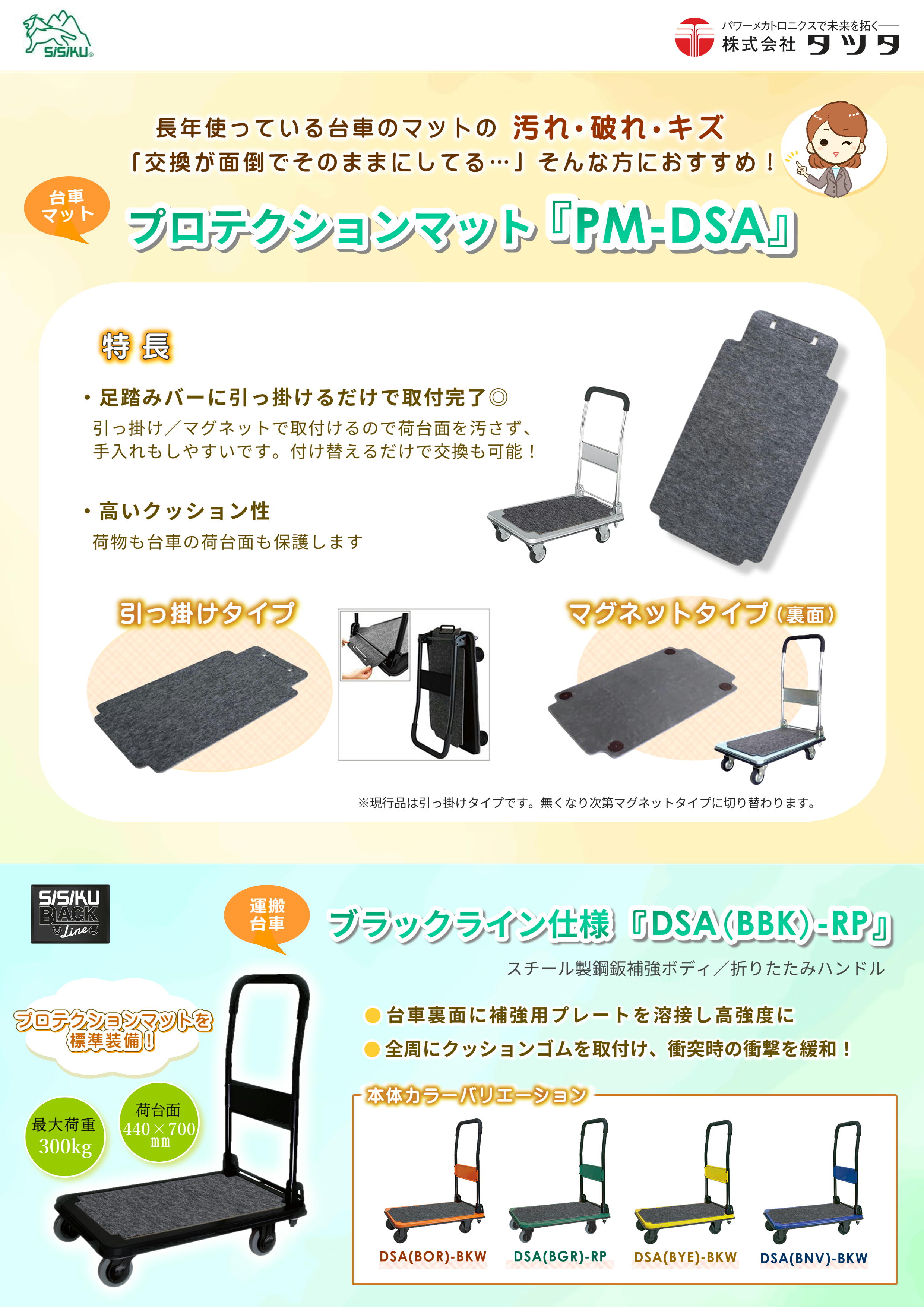 プロテクションマットPM-DSAはクッション性の高いマットで台車の荷台面の傷や汚れから保護します。引っ掛けタイプとマグネットタイプの2種類あり簡単に交換することができます。