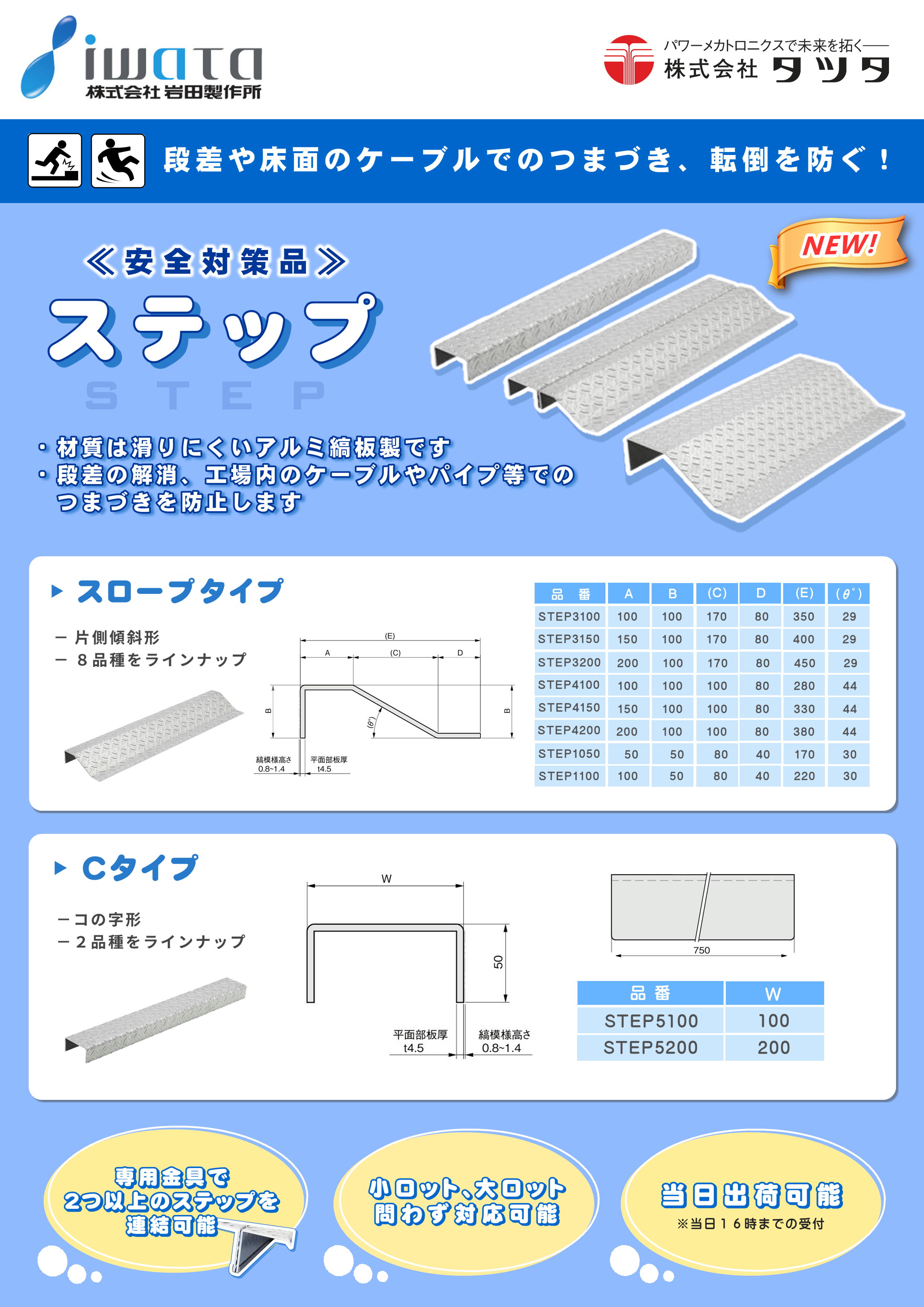 ステップは床面の段差やケーブルによるつまずき・転倒を防ぐ安全対策品です。軽量で滑りにくいアルミ縞板製で、「スロープタイプ」「Cタイプ」「連結金具」などの種類があります。工場や倉庫での転倒防止や、ケーブル・パイプの保護に効果的で、安全性と作業効率の向上に役立ちます。