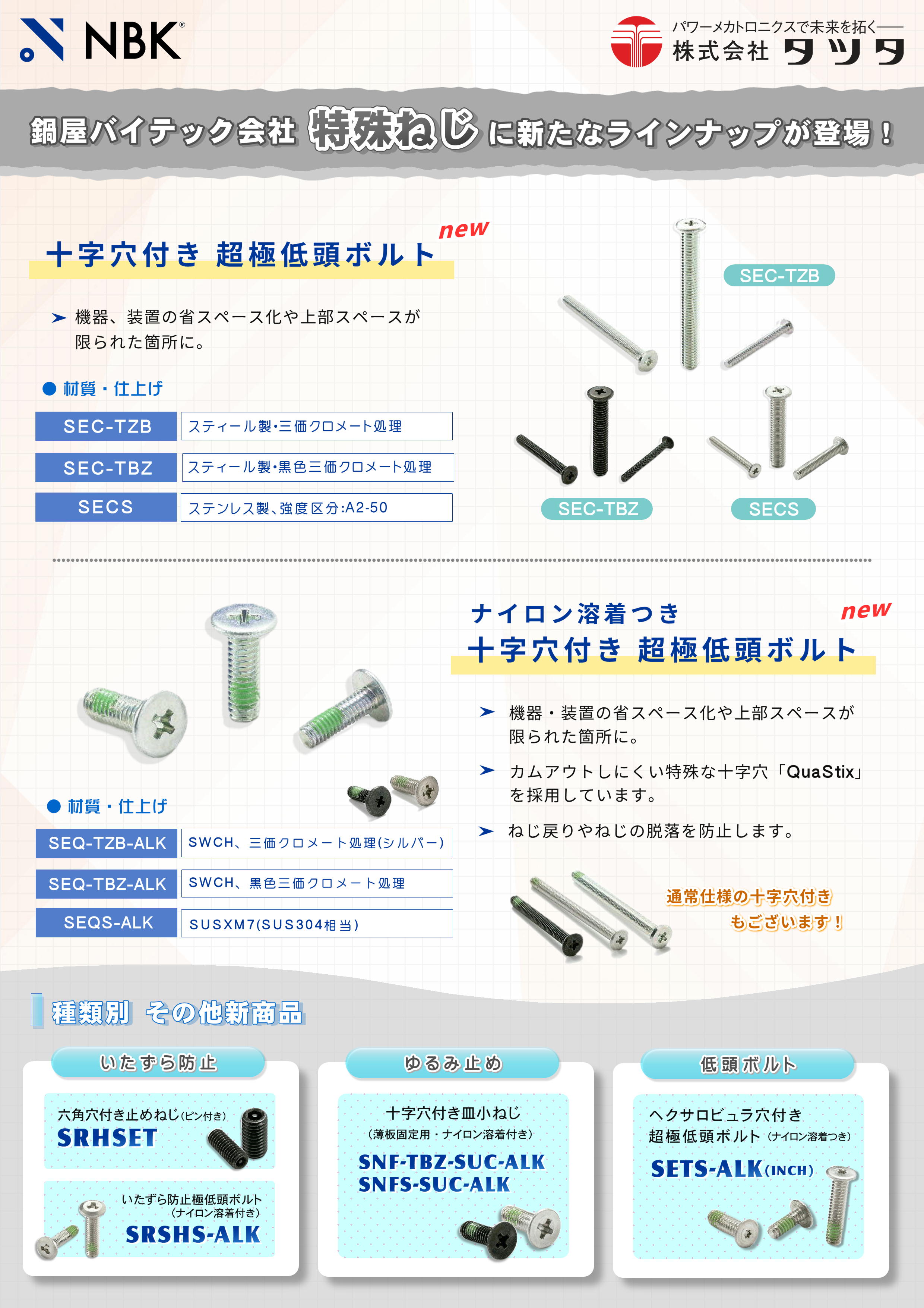 NBKの超極低頭ボルトは機器・装置の省スペース化や上部スペースが限られた箇所に有効です。また、ナイロン溶着つき商品はねじ部に溶着したナイロンの摩擦によってねじの戻り回転を抑制するため、締結力を失っても戻り回転が抑制されねじの脱落を防止します。