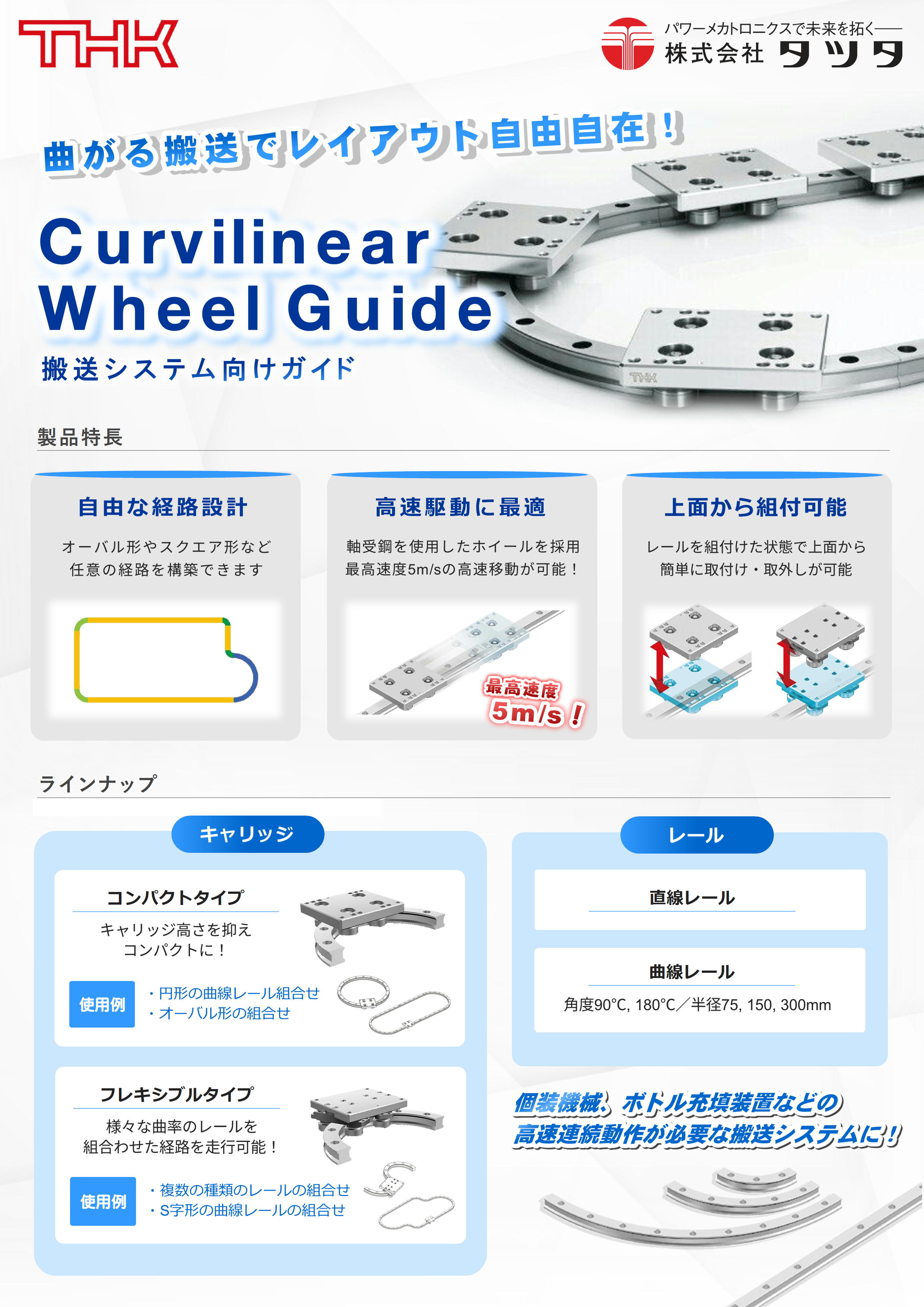 THK「Curvilinear Wheel Guide」は、直線と曲線を組み合わせて任意の搬送経路を構築でき、独自の転がり機構によりなめらかな動作を実現する案内装置です。コンパクトかつ、多方向荷重や高速連続搬送に対応できるため、各種搬送システムの高性能化に貢献します。