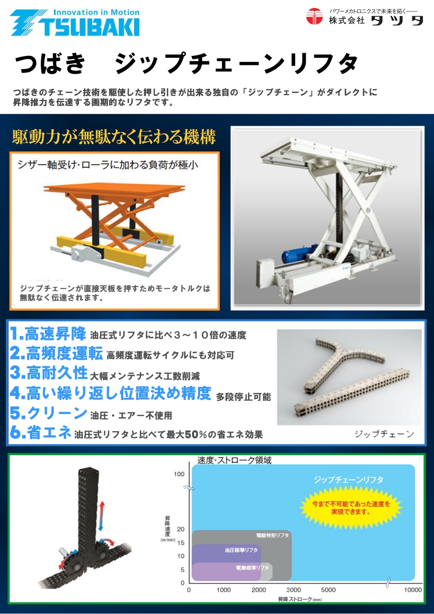 2本のチェーンがジッパーのように噛み合い、1本の強固な柱状になって「押し・引き」を実現する新開発のジップチェーン。このジップチェーンによりダイレクトに昇降推力を伝達する昇降機構(特許出願中)を採用したのが、「つばきジップチェーンリフタ」です。従来の昇降装置では実現不可能であった高速・高頻度運転を可能にしました。 (1)高速:油圧リフタに比べて3~10倍の昇降速度 (2)高頻度:超高頻度の運転サイクルにも対応 (3)高耐久:100万回以上の昇降テストをクリア(チェーンの伸び調整は不要) (4)高効率:油圧リフタに比べて20%を超える省エネルギー化(最大50%の省エネ効果) (5)お客様仕様で設計製作(駆動部、昇降機構の自由度が高い)