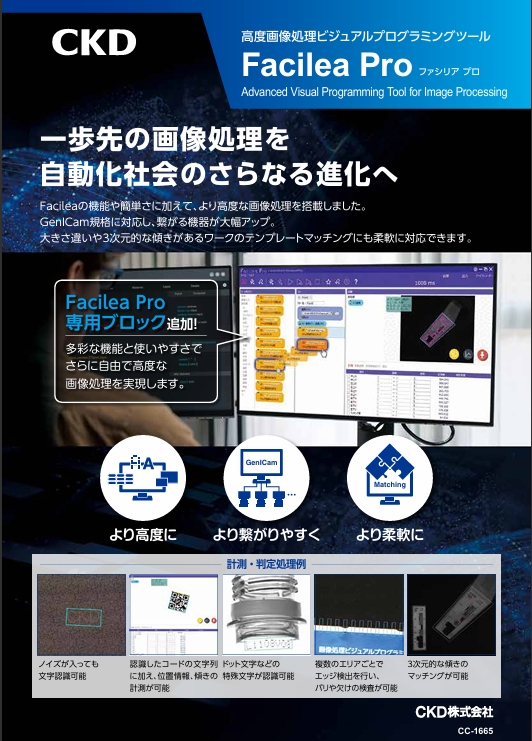 ビジュアルプログラミングツールFacilea Pro(ファシリア プロ)は従来のFacileaの機能や簡単さに加えて、より高度な画像処理を搭載しました。GenICam規格に対応し、繋がる機器が大幅アップ。大きさ違いや3次元的な傾きがあるワークのテンプレートマッチングにも柔軟に対応できます。