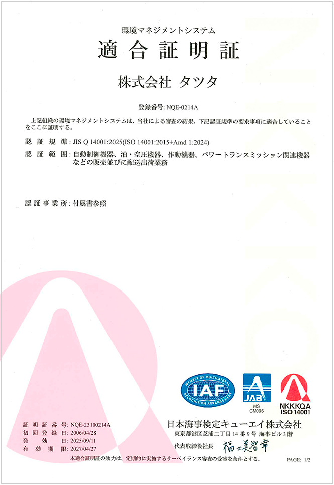 株式会社タツタは、自動制御機器、油・空圧機器、伝導機器などの販売活動を通して、環境の保全や創造及び継続的改善に積極的に取り組み, 健全な地球環境を次の世代に引き継いでいくことを基本理念として、地球にやさしい企業を目指します。代表取締役社長 碓井克久