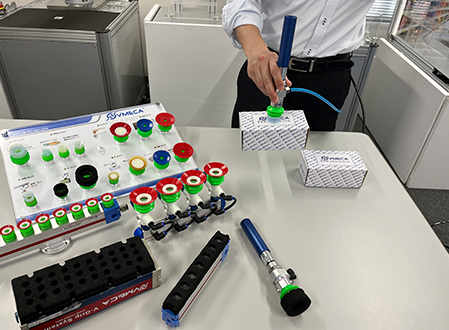 お客様より実際にハンドリングしたいワークを持参して頂き、その場で吸着テストを行います。
