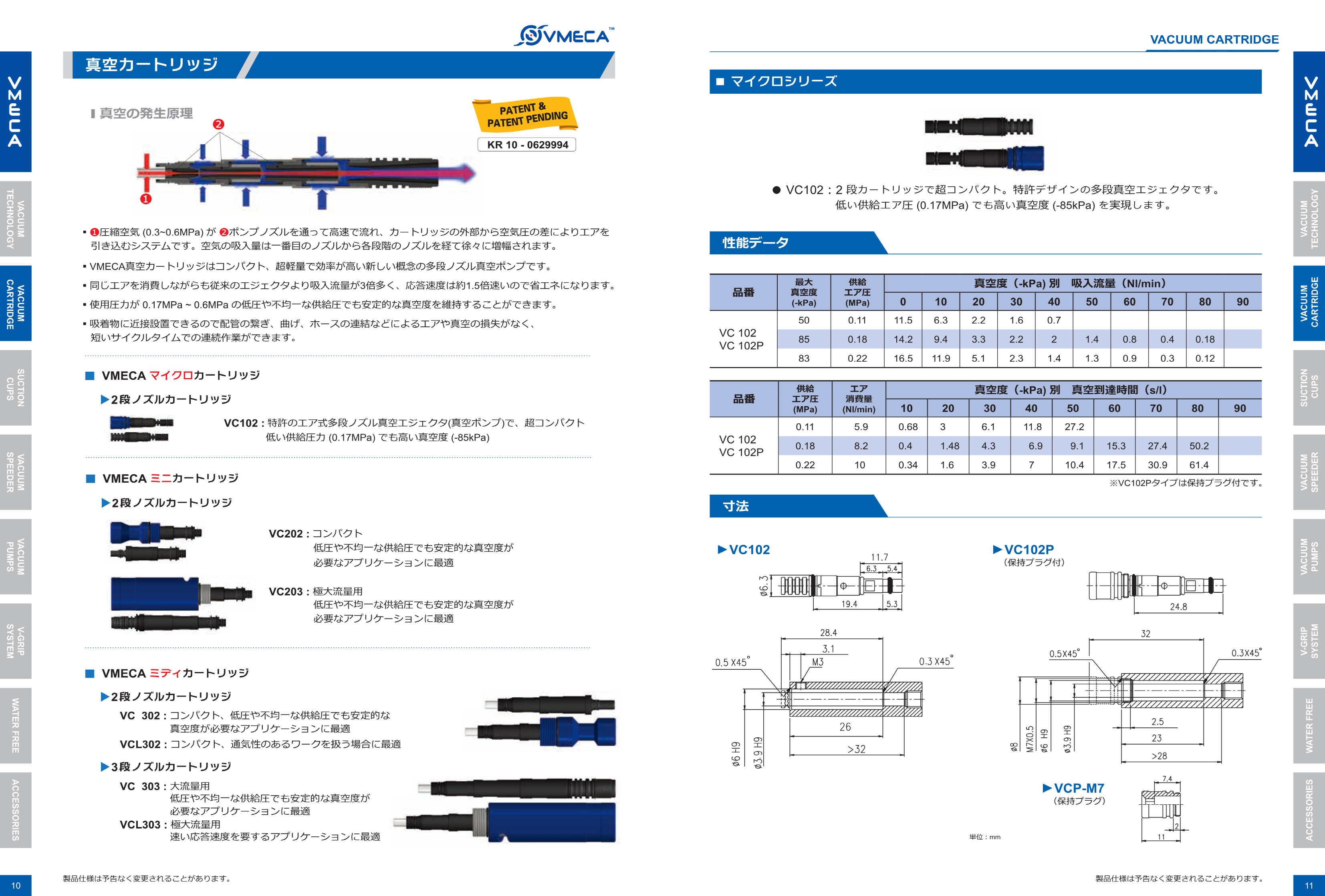 VC102:2 段カートリッジで超コンパクト。特許デザインの多段真空エジェクタです。低い供給エア圧 (0.17MPa) でも高い真空度 (-85kPa) を実現します。